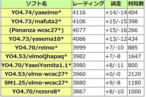 はじめに 以前の記事で紹介した、野生の読み太+elmoのブレンド評価関数である「yaselmo」がコンピュータ将棋のレーティングに造詣の深い、uuunuuun氏の検証によりelmoに比べて約レート+150ほどであることが公表された。 参考記事 www.fgfan7.com uuunuuun氏…